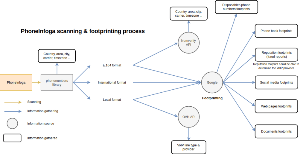 One of the most advanced tools to scan phone numbers using only free resources. The goal is to first gather basic information such as country, area, carrier and line type on any international phone numbers with a very good accuracy. Then try to determine the VoIP provider or search for footprints on search engines to try identify the owner.